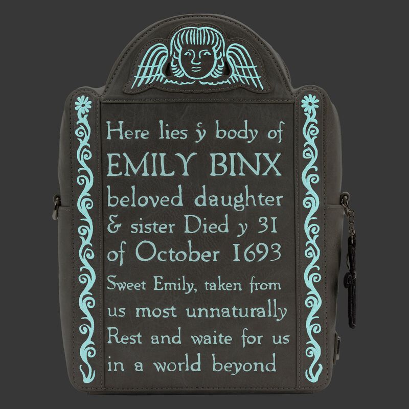 Celebrate the power of All Hallows’ Eve with the exclusive Disney Stitch Shoppe Hocus Pocus Here Lies Emily Binx Convertible Crossbody Bag. This interchangeable accessory forms of the headstone of Emily Binx, the late sister of Thackery. On the front, an engraved epitaph glows in the dark as it describes Emily’s early fate from the wicked Sanderson Sisters. Glow-in-the-dark embroidery highlights the grave’s details, and Thackery Binx appears nearby as a velvet bag charm to guard his sister’s spirit.