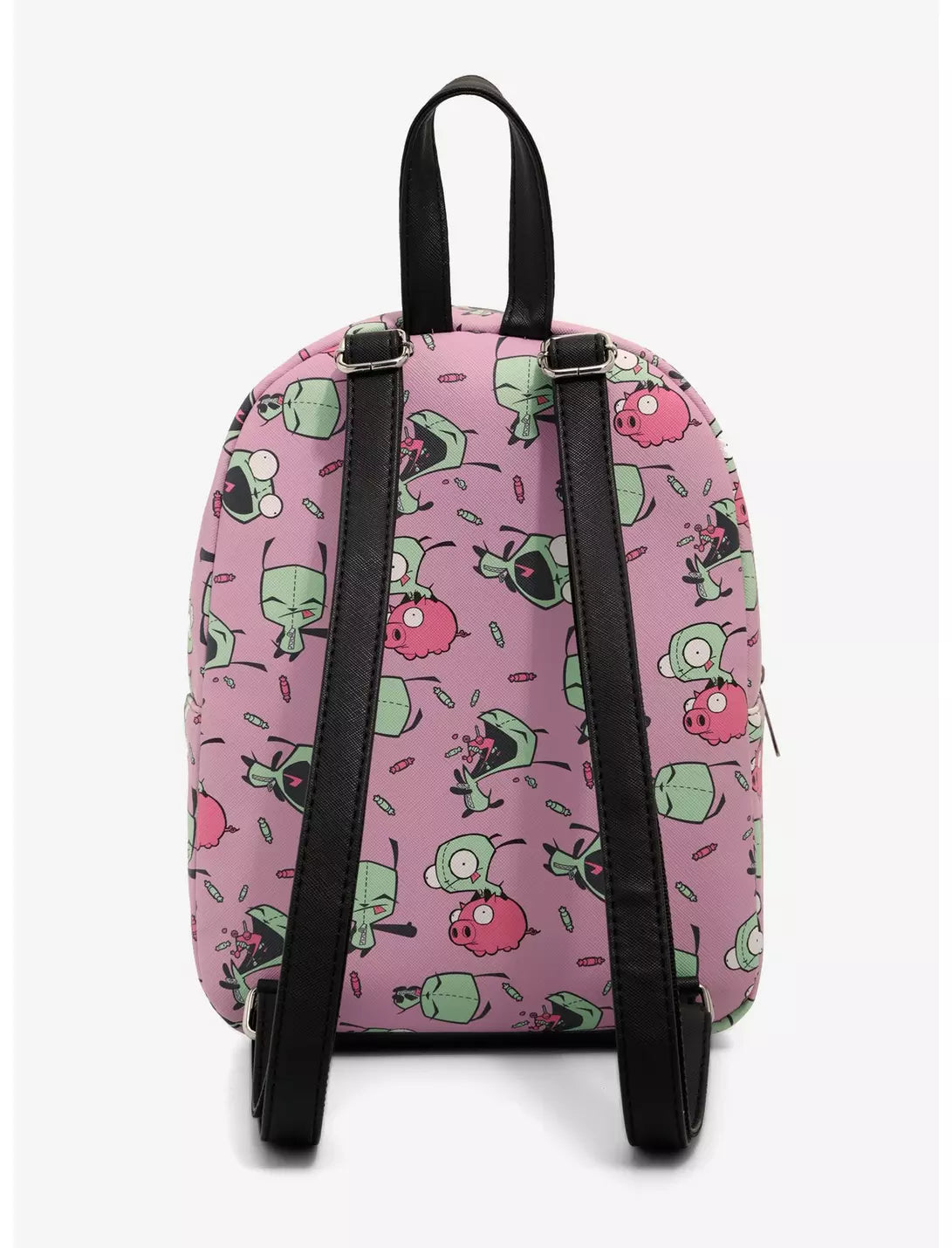 GIR and his Pig friend are here to infiltrate your bag collection! This mini backpack is pink with a fun allover print of GIR in different positions, including riding on the back of the Pig. The front has an enamel emblem of GIR's face. Adjustable straps and interior pocket.