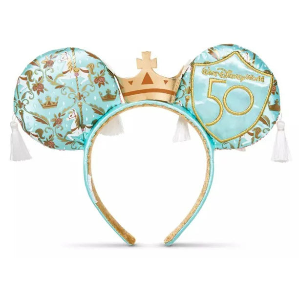 Padded satin ears with embroidery, sequins, and tassels. Back of the right ear features golden embroidered Walt Disney World 50th Anniversary logo crest, with a beautiful Golden crown topper in the center. Prince Charming Regal Carrousel printed on satin band, and with a Golden velour non-slip interior.