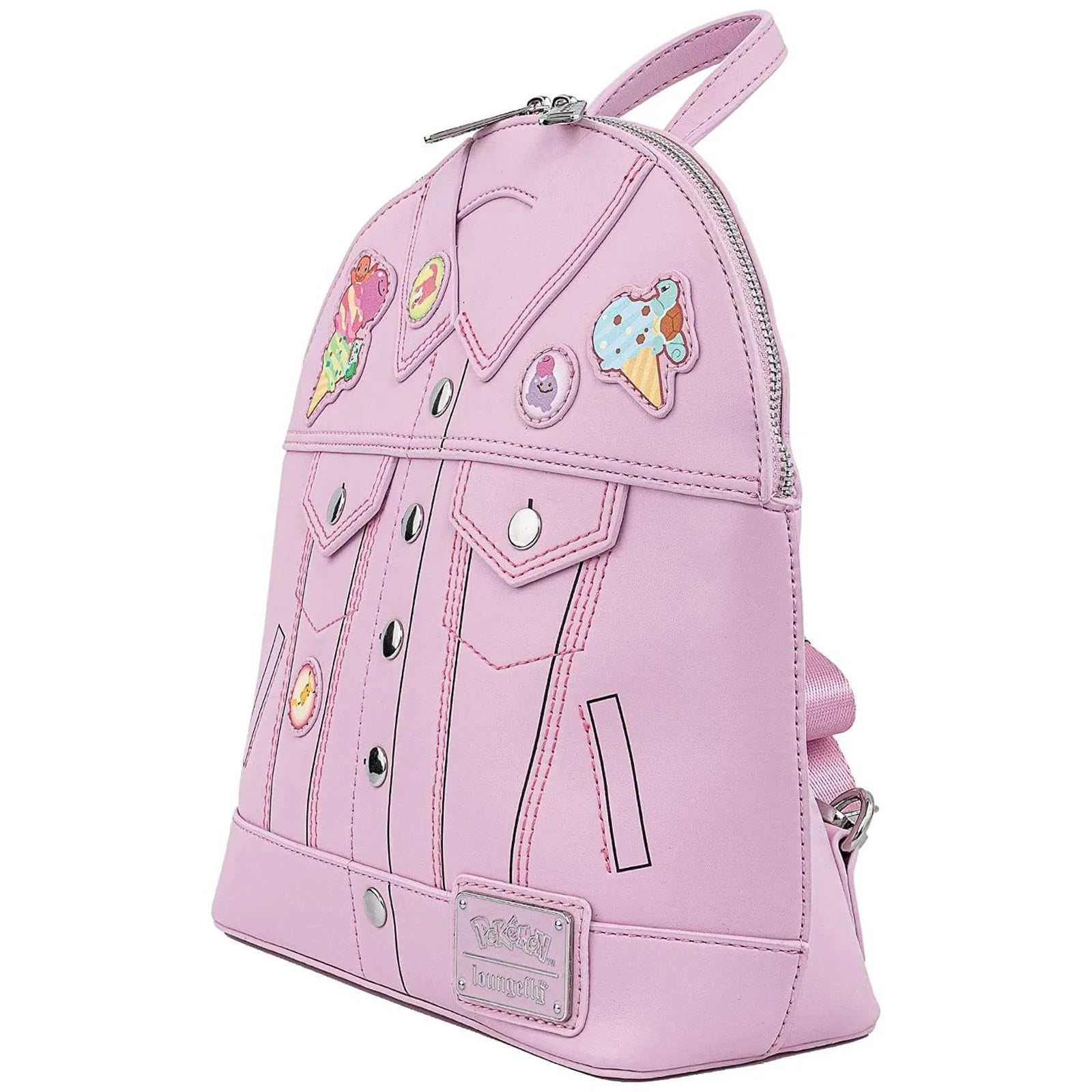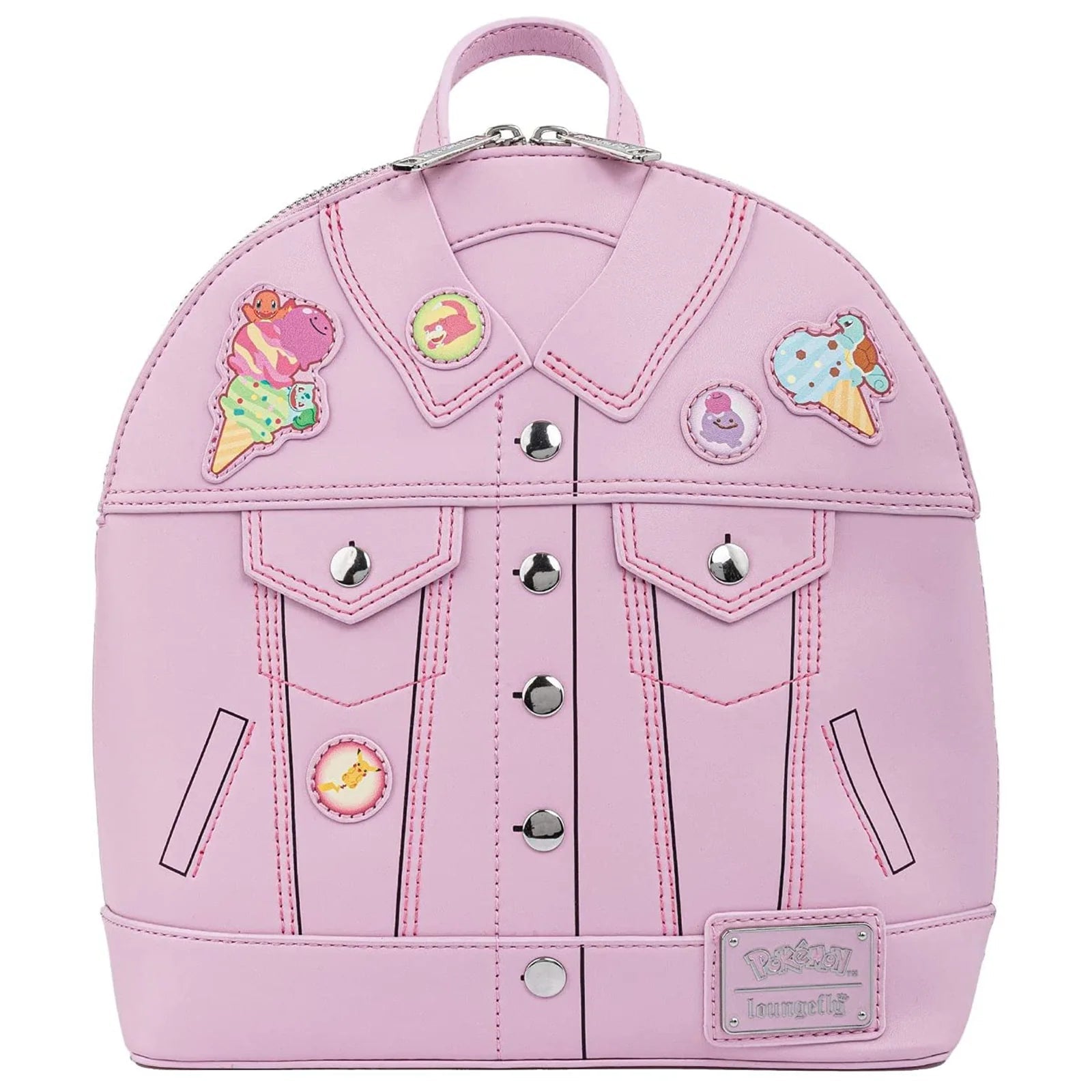Show off your love for Pokemon with this Ice Cream Denim Jacket Convertible Mini-Backpack! It is made of faux leather and features a top zipper closure, adjustable straps, matching themed lining, applique, embroidered, and printed details.