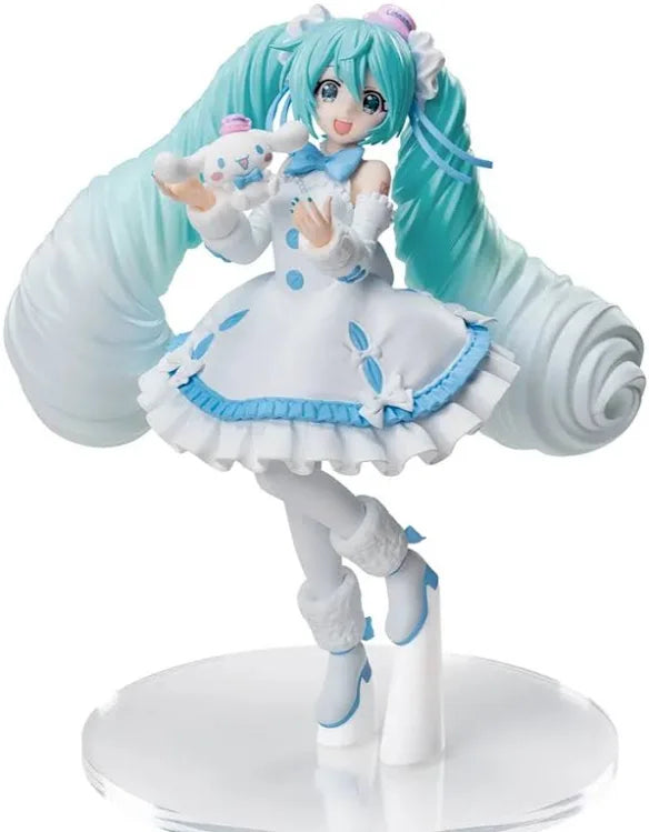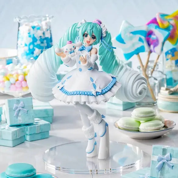 This limited edition Sanrio Cinnamoroll x Hatsune Miku collaboration prize figure is a MUST for any Cinnamoroll or Miku fan! Hard to turn up this delicious duo, featuring Hatsune Miku in a Cinnamoroll themed outfit and even her twin tails are meant to match Cinna's ears! Beyond adorable!!