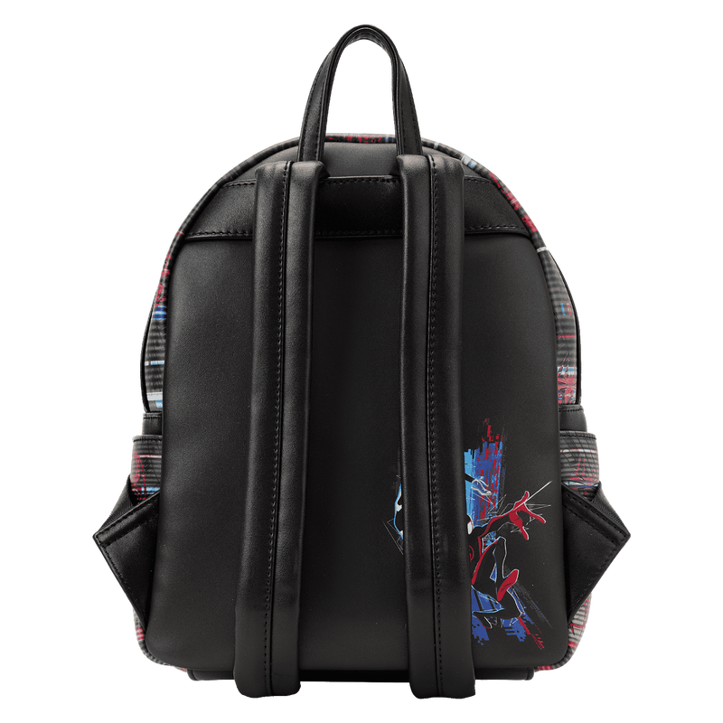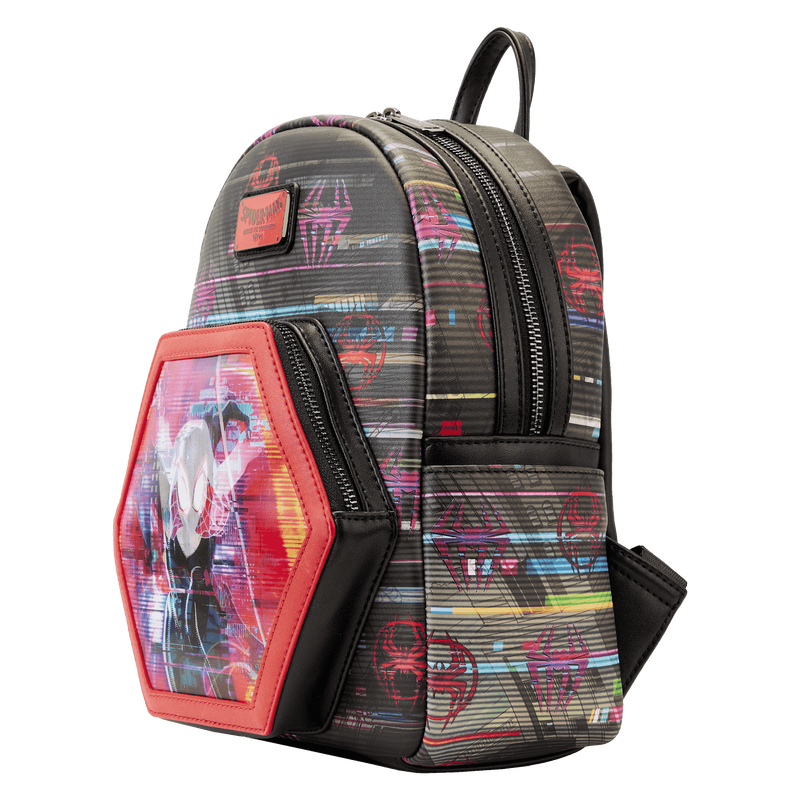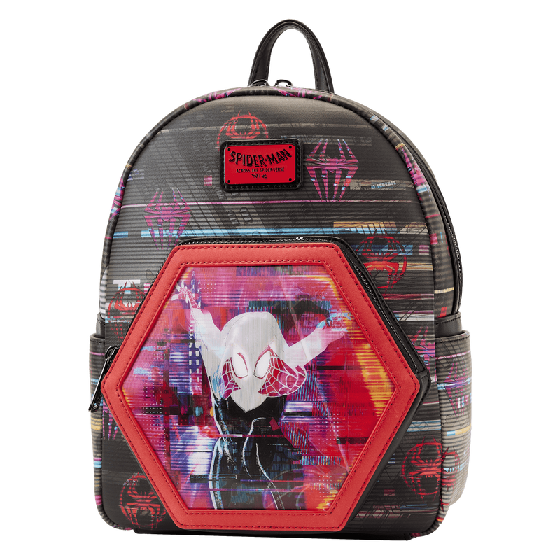 Thwip! Swing through any challenge with the Loungefly Across the Spider-Verse Lenticular Mini Backpack. On the front of this inter-dimensional accessory, a glitchy textured motif features heroic symbols from the Spider-Verse. Down below, Miles Morales leaps through a portal taking the shape of the bag’s front zipper pocket. Tilt the bag in the light to reveal Spider-Gwen as she dives through the portal, which also features a red glow-in-the-dark frame. Sling the bag around to see an encore appearance of Gwen and Miles. This action-packed mini backpack will keep your essentials safe as you travel the depths of space and time.