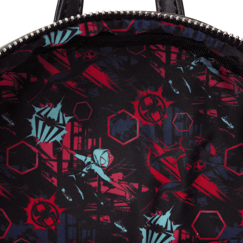 The Loungefly Across the Spider-Verse Lenticular Mini Backpack is made of vegan leather (polyurethane). Bag has adjustable shoulder straps and sturdy metal hardware. Additional features include applique, glow-in-the-dark, lenticular, and printed details. Take note of the coordinating inside lining.