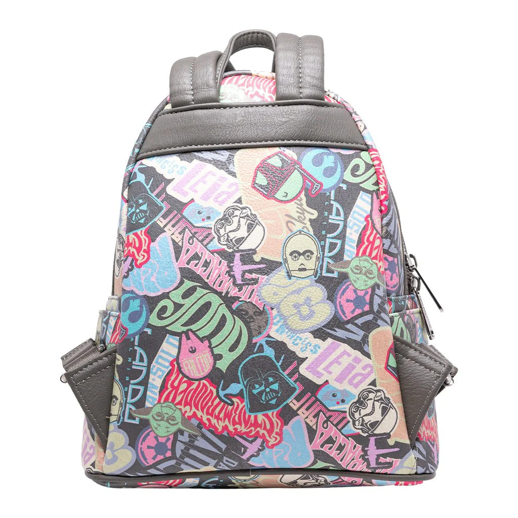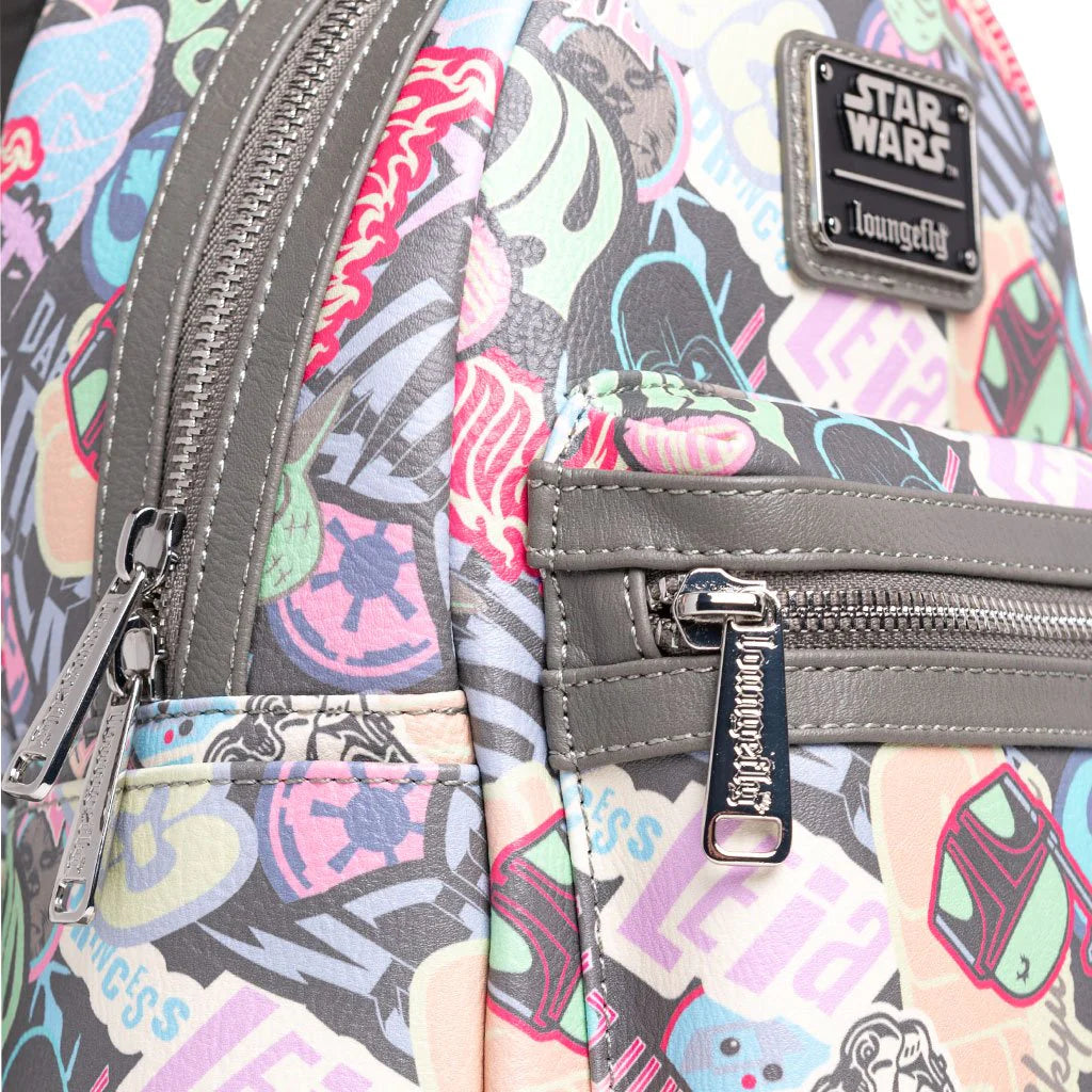 Loungefly Star Wars Pastel Graffiti Sticker Allover Print Mini Backpack has sticker prints all over this faux leather, intergalactic accessory! Rock this anywhere you go, especially the streets of Coruscant. It will hold all daily essentials within the two main compartments and two side pockets.