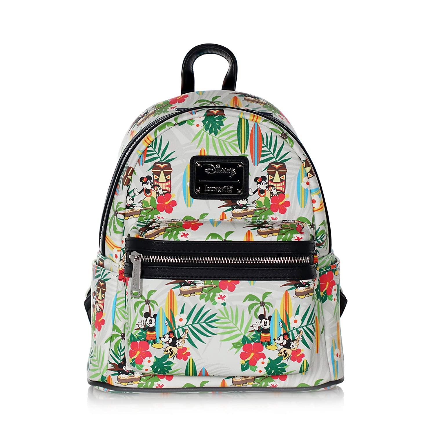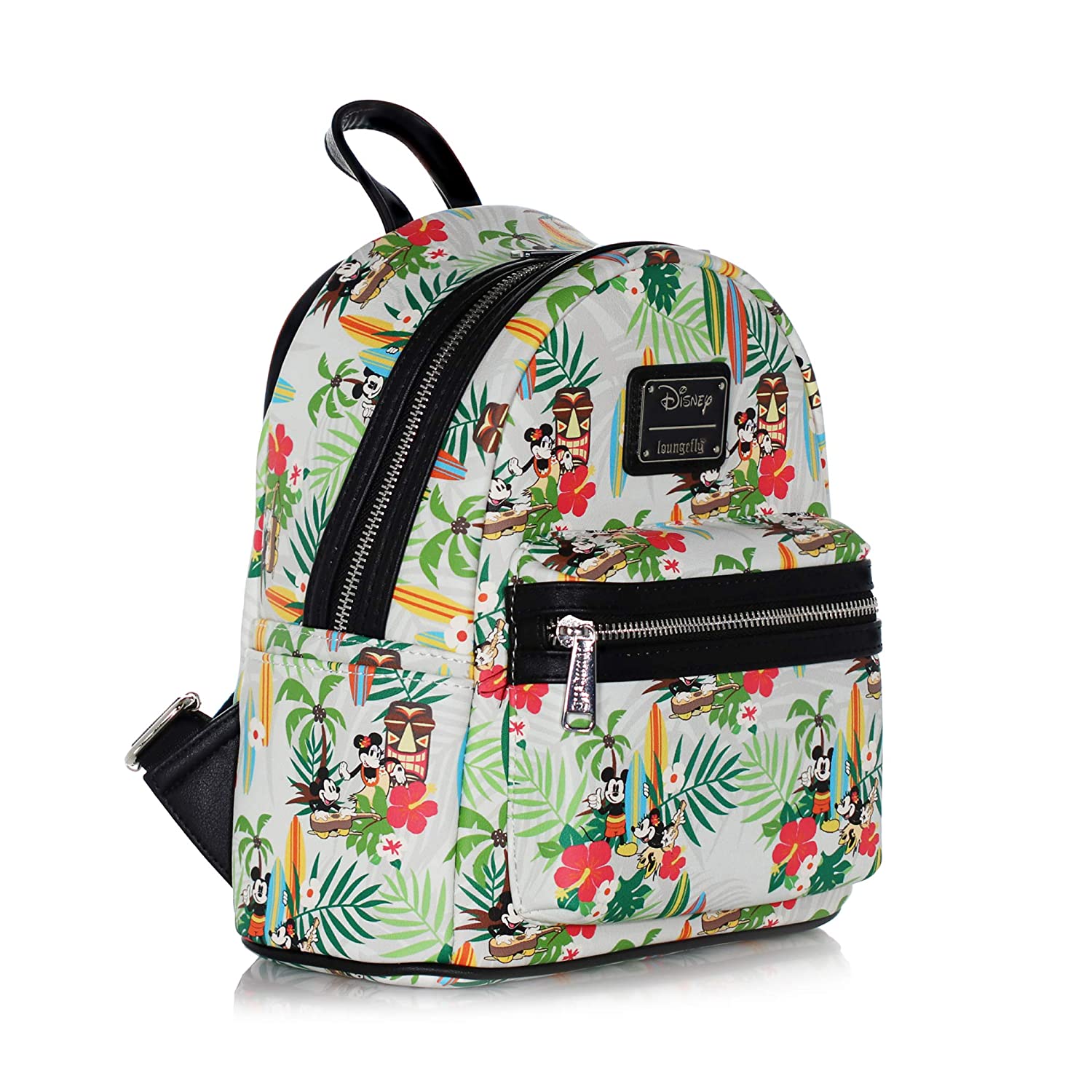 Featuring colorful scenes of Mickey and Minnie in a tropical apparel surfing with tropical plants and flowers. Silver tone hardware with Loungefly engraved double zipper pulls. Lined interior. Each side has an exterior slide pocket. Loungefly logo on front. Adjustable straps. Fun, bright and eye-catching!