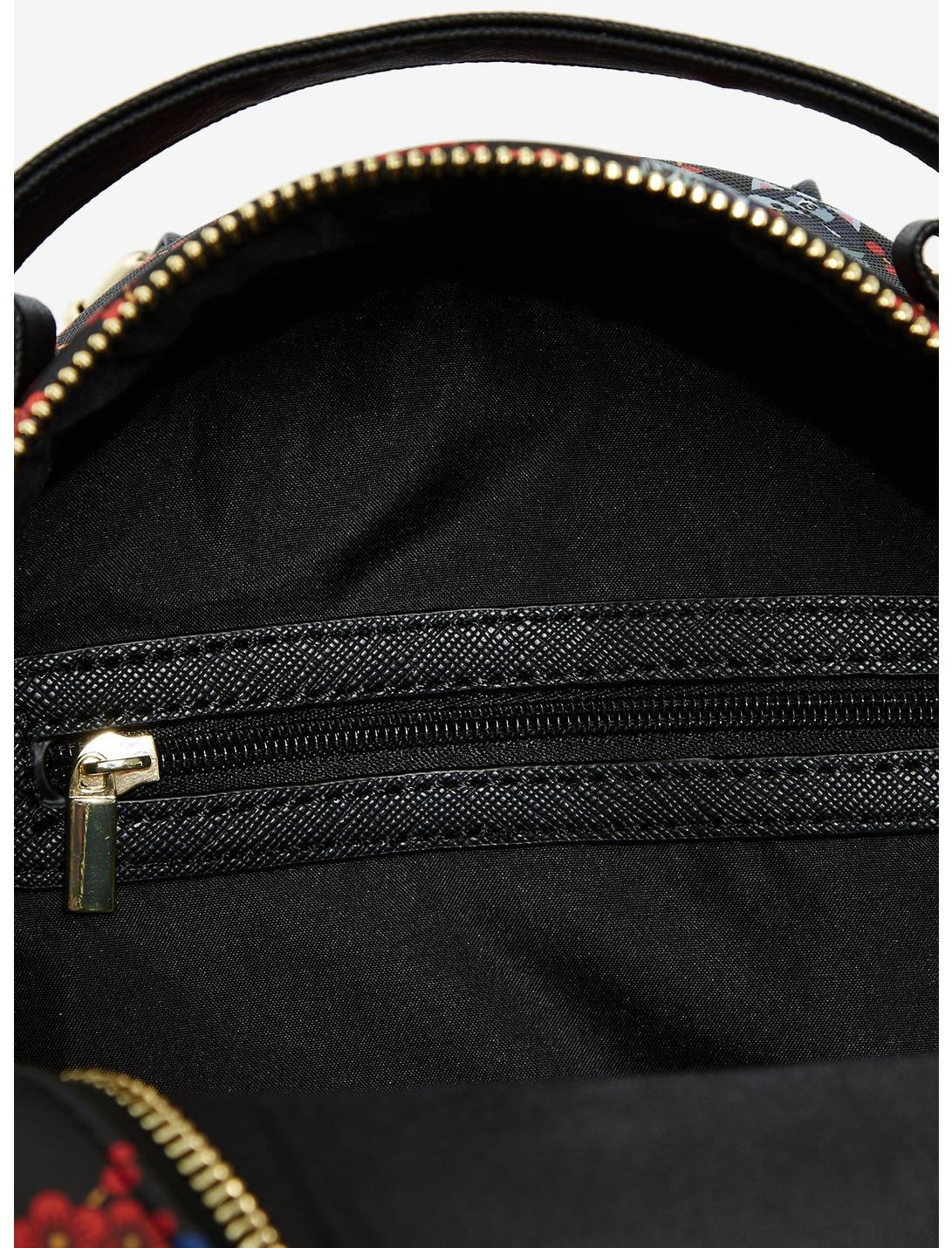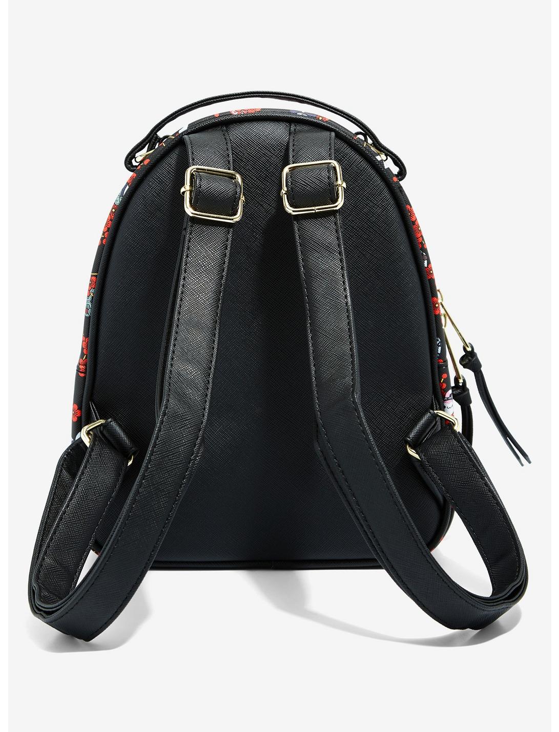 The mini backpack features enamel charms of Naruto, Sasuke and a cherry blossom on the outside pocket, interior pocket, adjustable shoulder straps, and Nyaruto enamel brand badge.