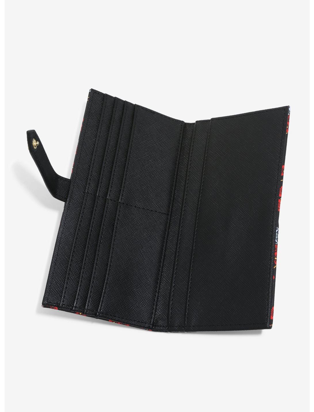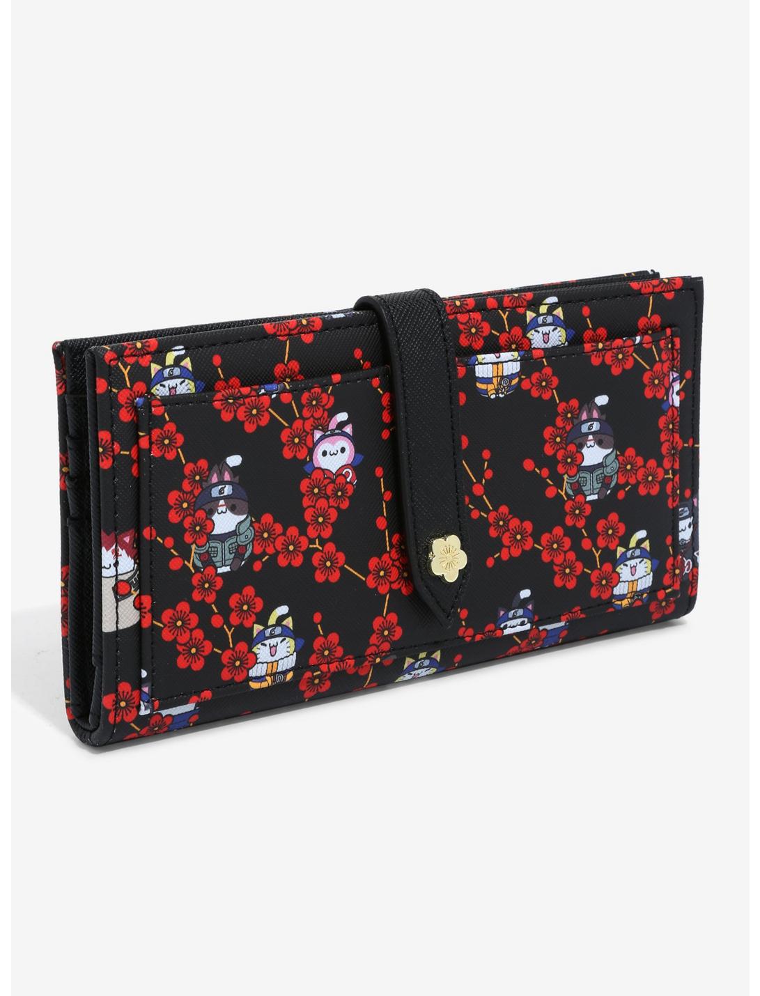 The wallet features a cherry blossom button clasp, outside pocket, multiple interior card and bill slots, and Nyaruto brand badge.