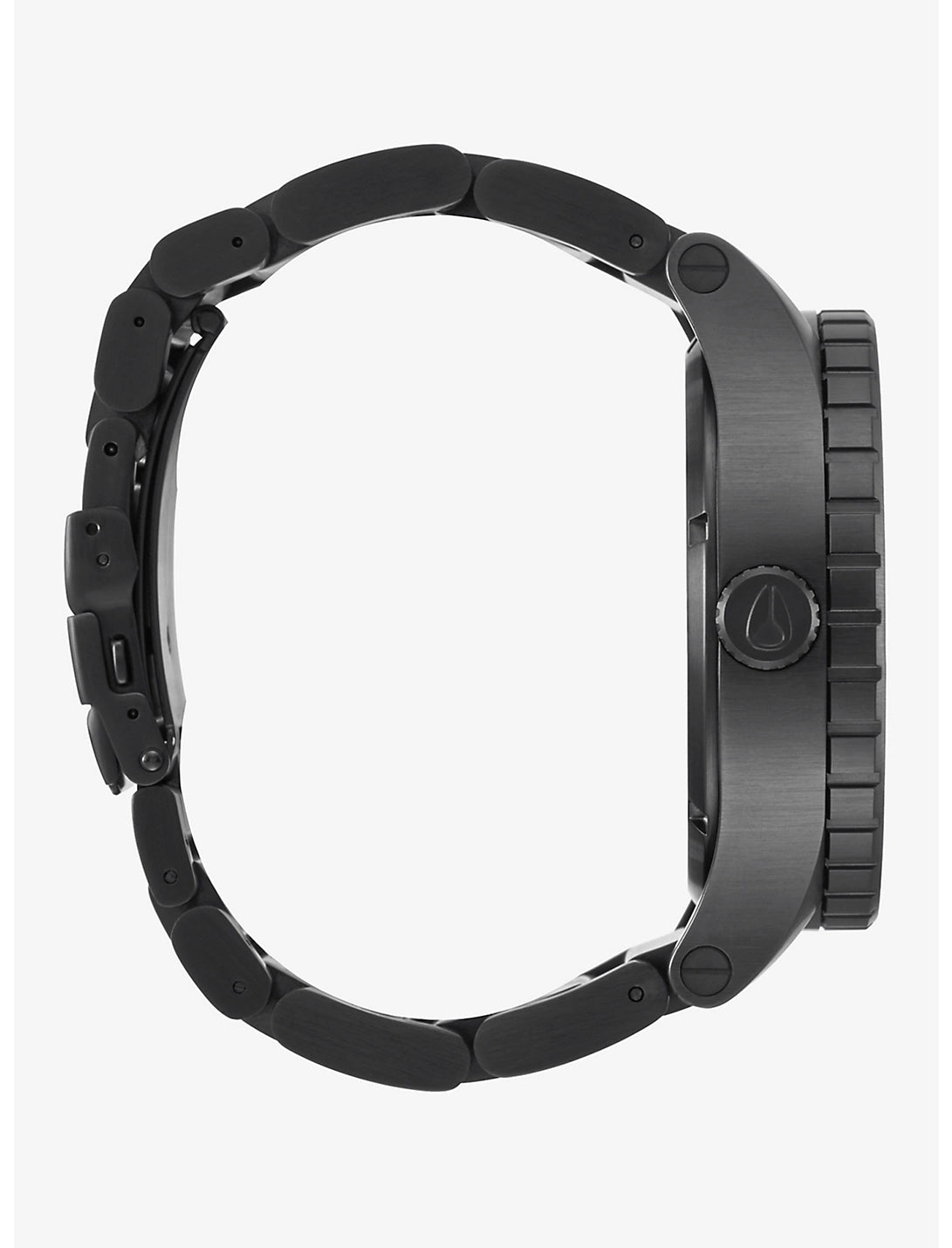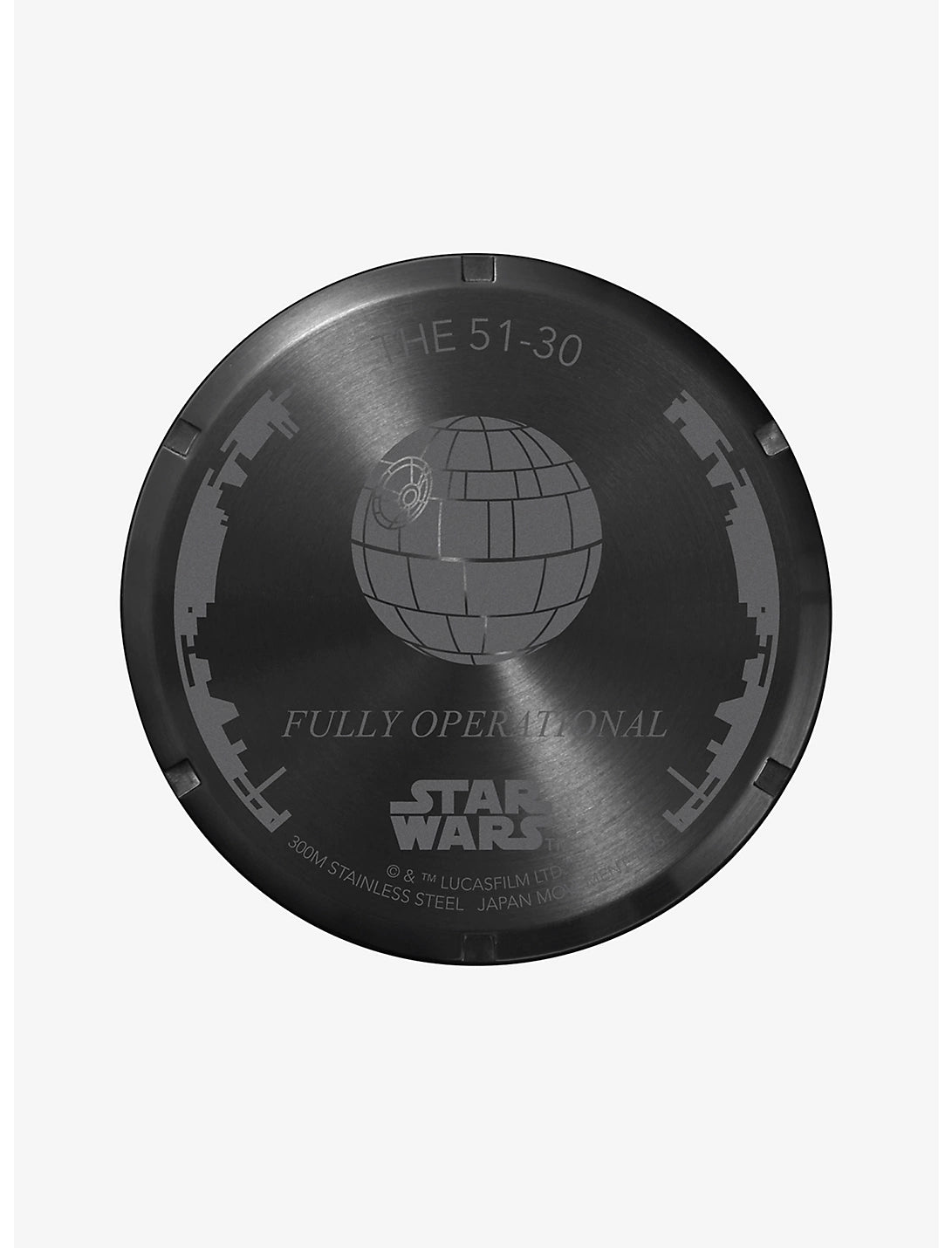 A look at the Death Star 51-30. Death Star at 10 o'clock hour marker. Laser cannon seconds hand. Inner dial ring Death Star detail with lum. Miyota Japanese quartz 3 hand with crown placement at 9 o'clock. The dial is surrounded by a concave dial ring and includes bold printed indices, a printed seconds track, custom molded hands with luminous fill. 51mm, 300 meter/30 ATM custom solid stainless steel, solid stainless steel unidirectional rotating bezel with countdown timer, hardened mineral crystal, triple gasket screw down crown and pusher, stainless steel screw down caseback and screw pin lugs. 25 mm custom solid stainless steel 3-link bracelet with stainless steel double locking clasp with micro adjust.