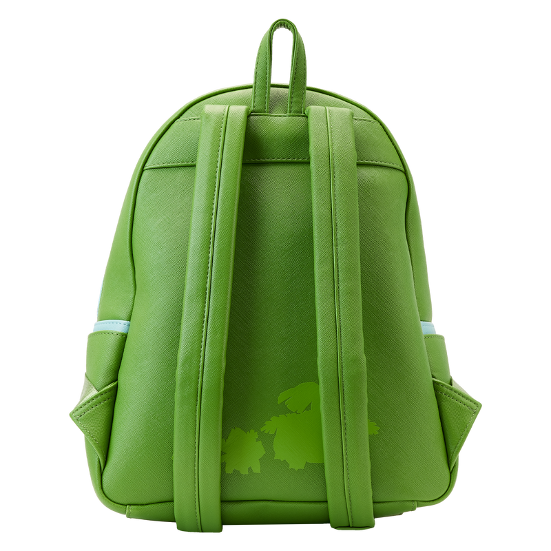 The Loungefly Pokemon Bulbasaur Evolutions Triple Pocket Backpack is made of vegan leather (polyurethane). Bag has adjustable shoulder straps and sturdy metal hardware. Additional features include debossed and printed details. Take note of the coordinating inside lining.