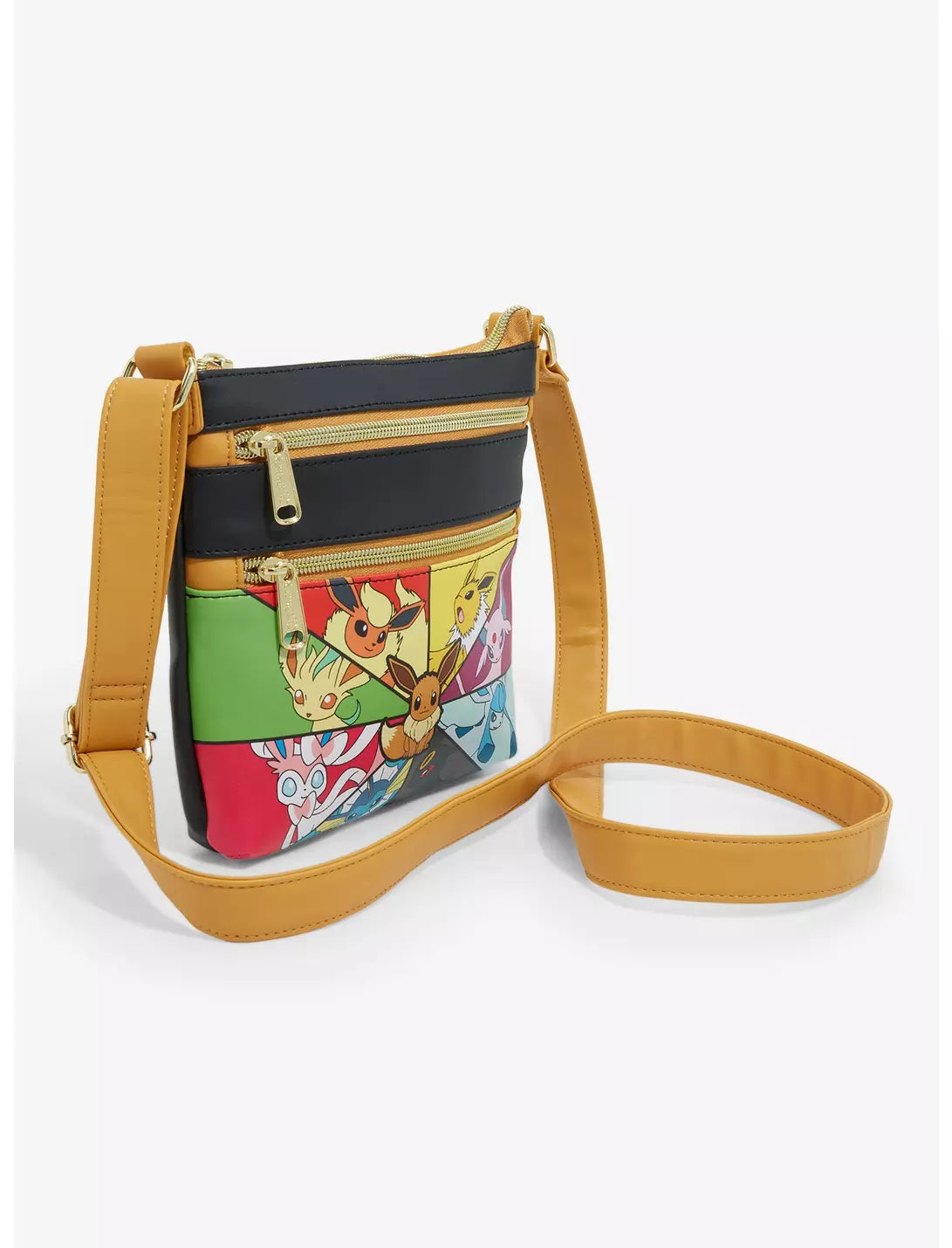 Carry your training essentials in style with this Pokemon-inspired crossbody bag! Featuring a design of Eevee surrounded by portraits of Jolteon, Vaporeon, Flareon, Umbreon, Espeon, Glaceon, Sylveon, and Leafeon on the front, the back includes another portrait of Eevee. With three zippered pockets and an adjustable crossbody strap, this bag is perfect for bringing to your next Pokemon battle.