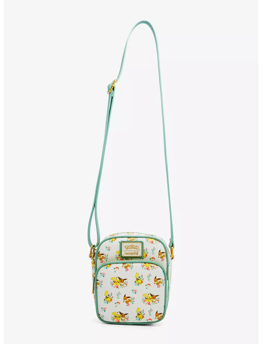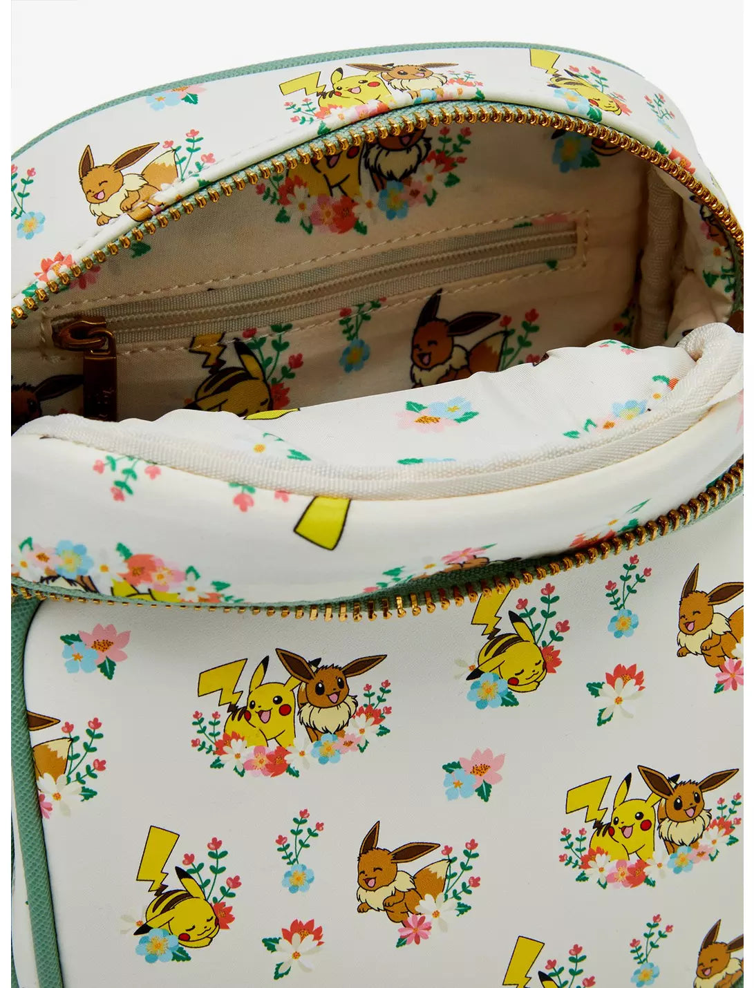 Pikachu and Eevee have wandered onto this crossbody! An allover print of the pair adorns