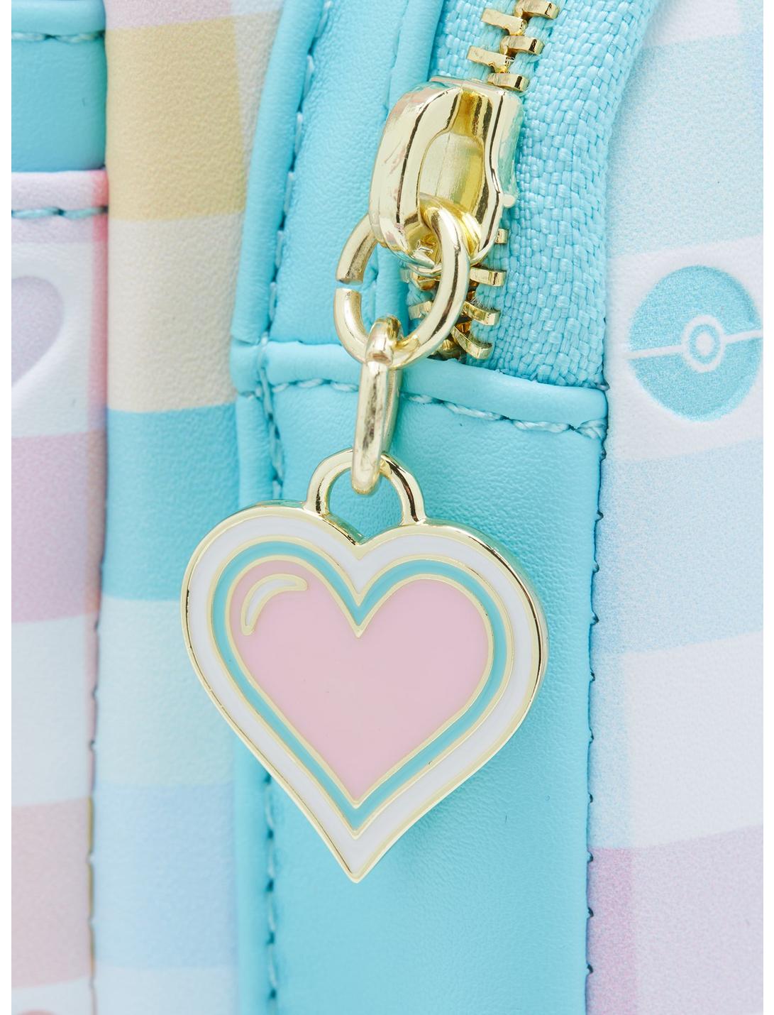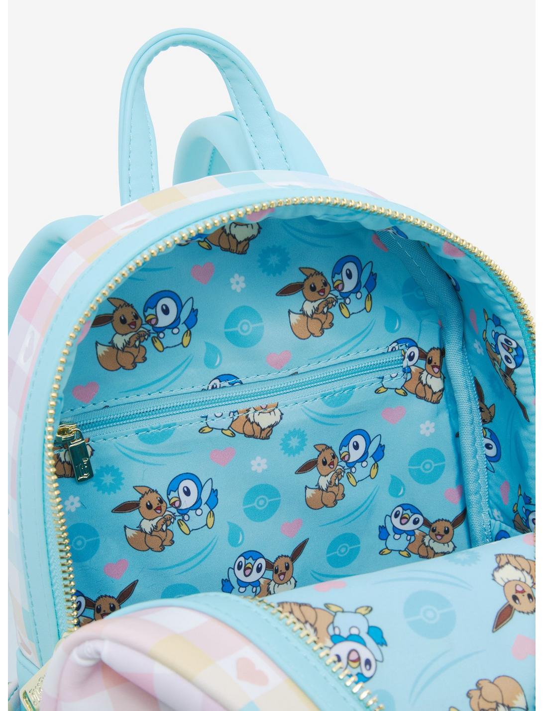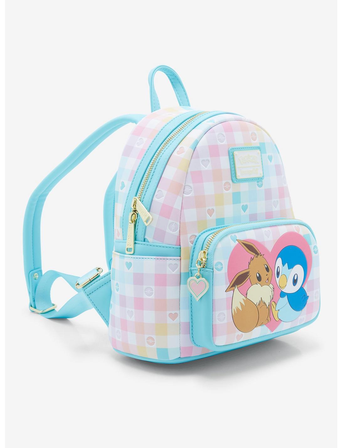 You can catch 'em all in style with this Pokemon Loungefly mini backpack! Featuring a pastel gingham print with debossed heart and Pokeball details, the front pocket design features Eevee and Piplup sitting in front of a heart. With a heart zipper charm, adjustable straps, and side pockets, this backpack is perfect for Pokemon hunting with friends.