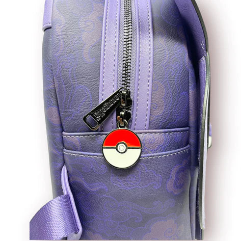 Show off your love of this clever ghost type Pokemon, Gengar, with this brand new cosplay style bag! Featuring a full body cutout of Gengar, and a matching lining with several cute expressions. On the back is a super cute encore print of the sinister Pokemon itself. This backpack also features an enamel zipper pull of a Pokeball.