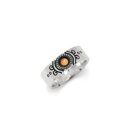 The main body is made of 925 silver, and the characteristic patterns are carved and then oxidized. The gemstone part is made of Synthetic Carnelian.