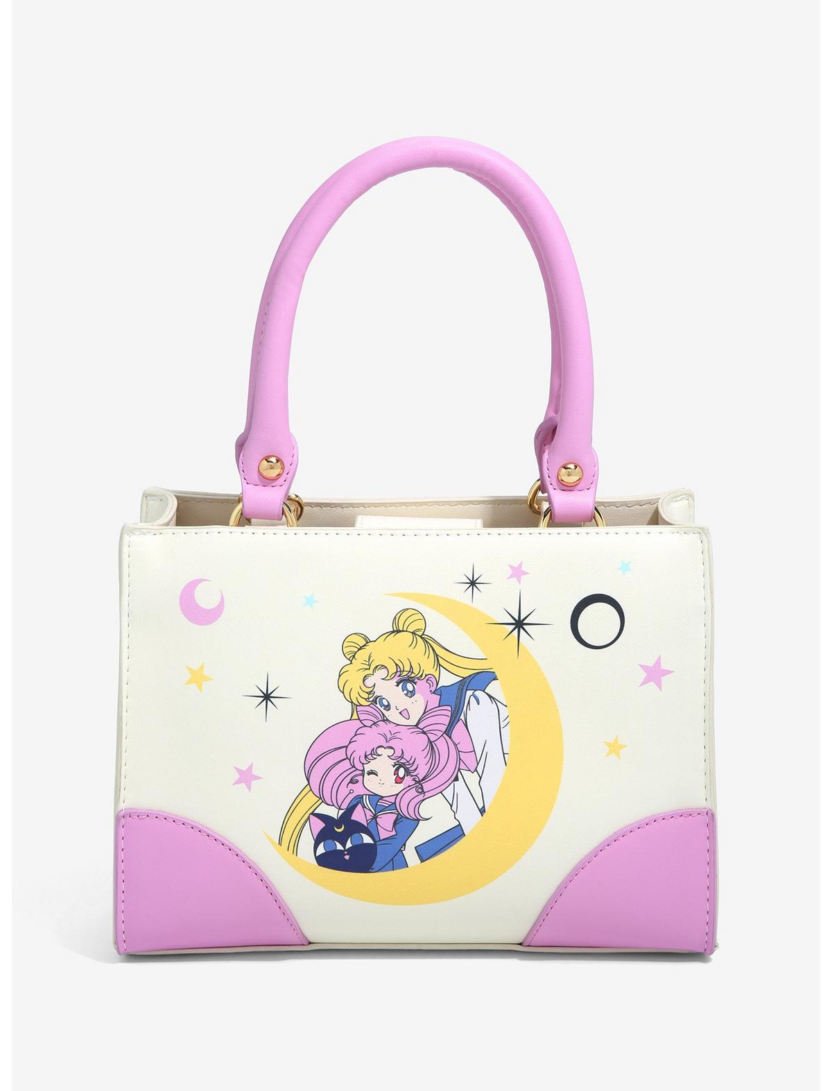 Channel your inner Sailor Guardian whenever you don this anime-inspired handbag! Based on their appearances in Pretty Guardian Sailor Moon, Sailor Moon and Sailor Chibi Moon decorate the back design, detailed with a starry sky. With a gold-toned chain on the front featuring charms of Luna, the Spiral Heart Moon Rod, and Chibi-Usa's Luna-P device, this bag makes the perfect accessory for fighting evil, winning love, and everything in between! Also features an adjustable shoulder strap, an enamel brand badge, and a Sailor Guardian Wand interior lining pattern.