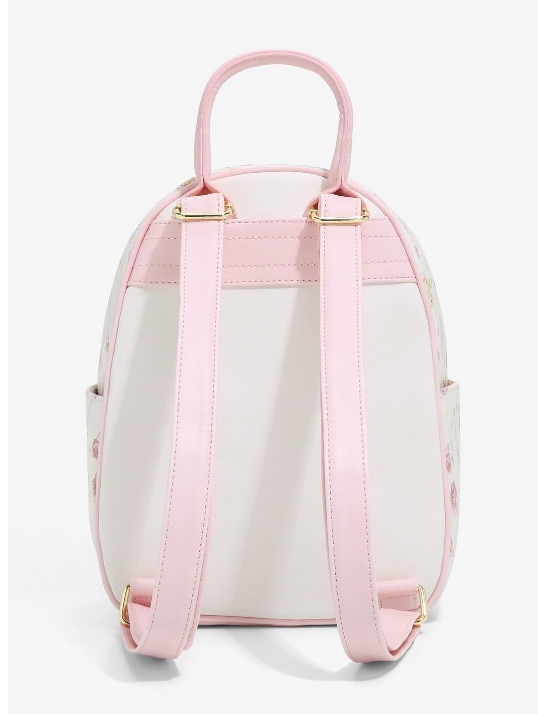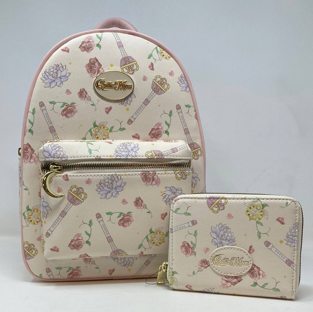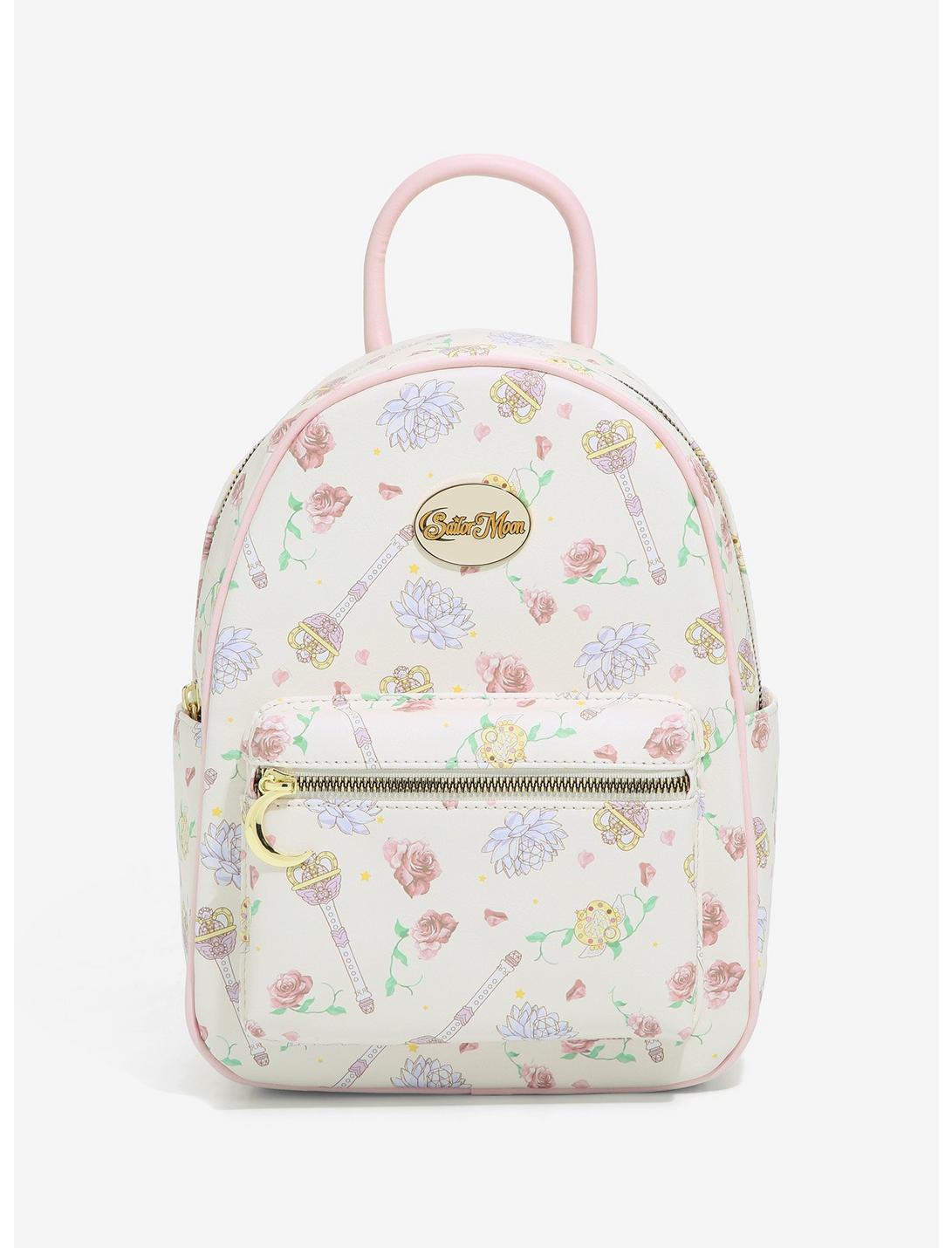Need something to hold all of your magical items when you're out fighting for love and justice? Add this mini backpack to your Sailor Guardian uniform! This Sailor Moon backpack features a muted pastel toss of the Silver Crystal, Eternal Tiare, Eternal Moon Article and roses all over. Comes with a crescent moon front zipper charm, embossed Sailor Moon logo up top, side pockets, interior drop pocket and firm top carrying handle.