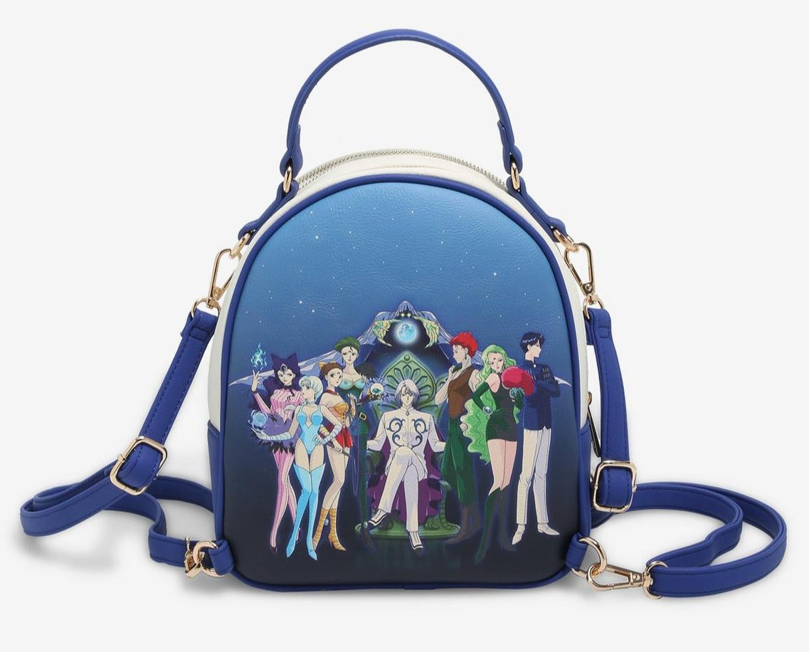 Carry all your daily essentials with the power of love and friendship! Or depending on the day, channel the Dark Crystal and run with the Black Moon Clan when you sport this Pretty Guardian Sailor Moon reversible mini backpack! One side sports a vibrant group graphic of the battle-ready Sailor Guardians against a crescent moon as the other side dons a brooding look into the iconic group of the Black Moon.