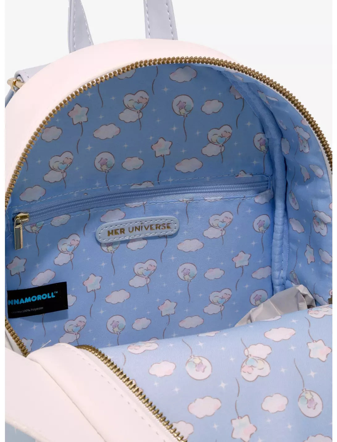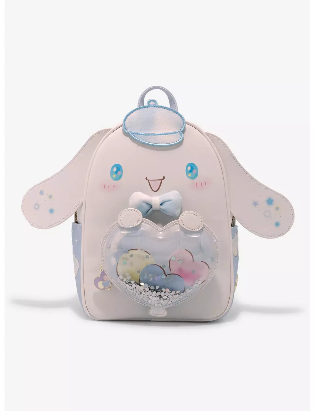 Pack your essentials into this dreamy backpack before you take to the skies! This Sanrio mini backpack features Cinnamoroll with 3D figural ears and a textured cap and bow on.