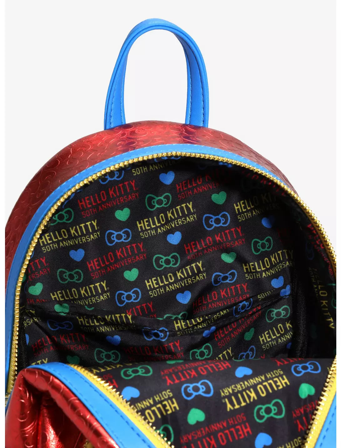 Hello Kitty is always in style, but her 50th anniversary look is extra charming! This mini backpack features a clear front pocket with printed details, creating a layered effect with the fabric behind it to result in a delightful image of Hello Kitty on her bike. It's topped with an applique of a coin purse's hardware, fastened with a rubber apple zipper pull. The shiny red body sports allover embossed bows, creating a sleek look for any outing.