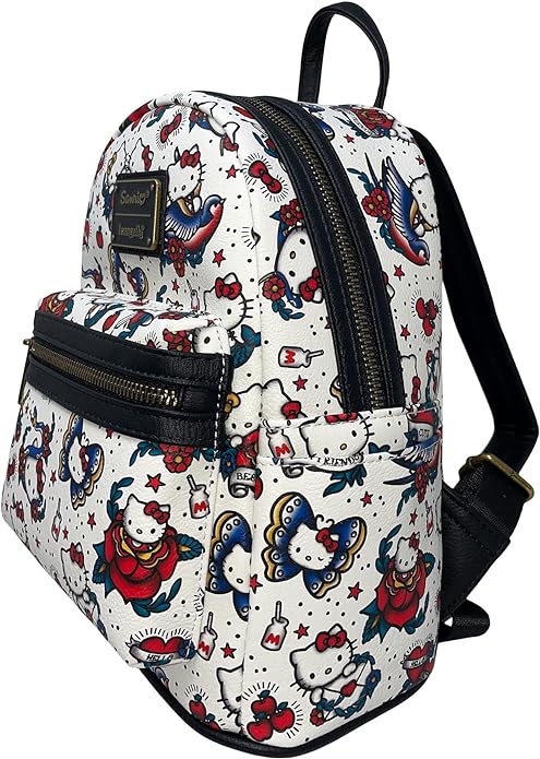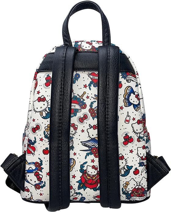 This Loungefly Sanrio Hello Kitty Tattoo AOP Mini Backpack is made of faux leather with zipper closures, top handle and adjustable straps.