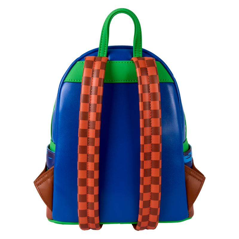 This mini backpack celebrates all things Sonic. The 3D front pocket features Doctor Eggman (aka Doctor Ivo Robotnik). The front of his ship lights up! Above him, you'll find Sonic and Tails. Rings float behind them, and the rest of the bag is covered in a pixelated landscape reminiscent of the game.