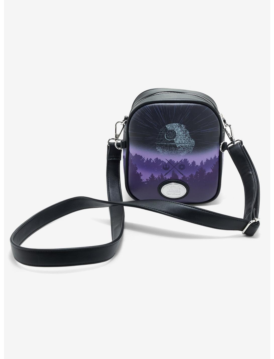 Join the Rebellion and stand up against the Empire with this Star Wars crossbody bag from Our Universe! Inspired by Return of the Jedi, this bag features Leia, Han Solo, and Chewbacca amongst various icons from the film including Darth Vader's helmet, while the back features a portrait of the Death Star. With embroidered and debossed details, a removable crossbody strap, and an interior zipper pocket, this bag is perfect for saving the galaxy.