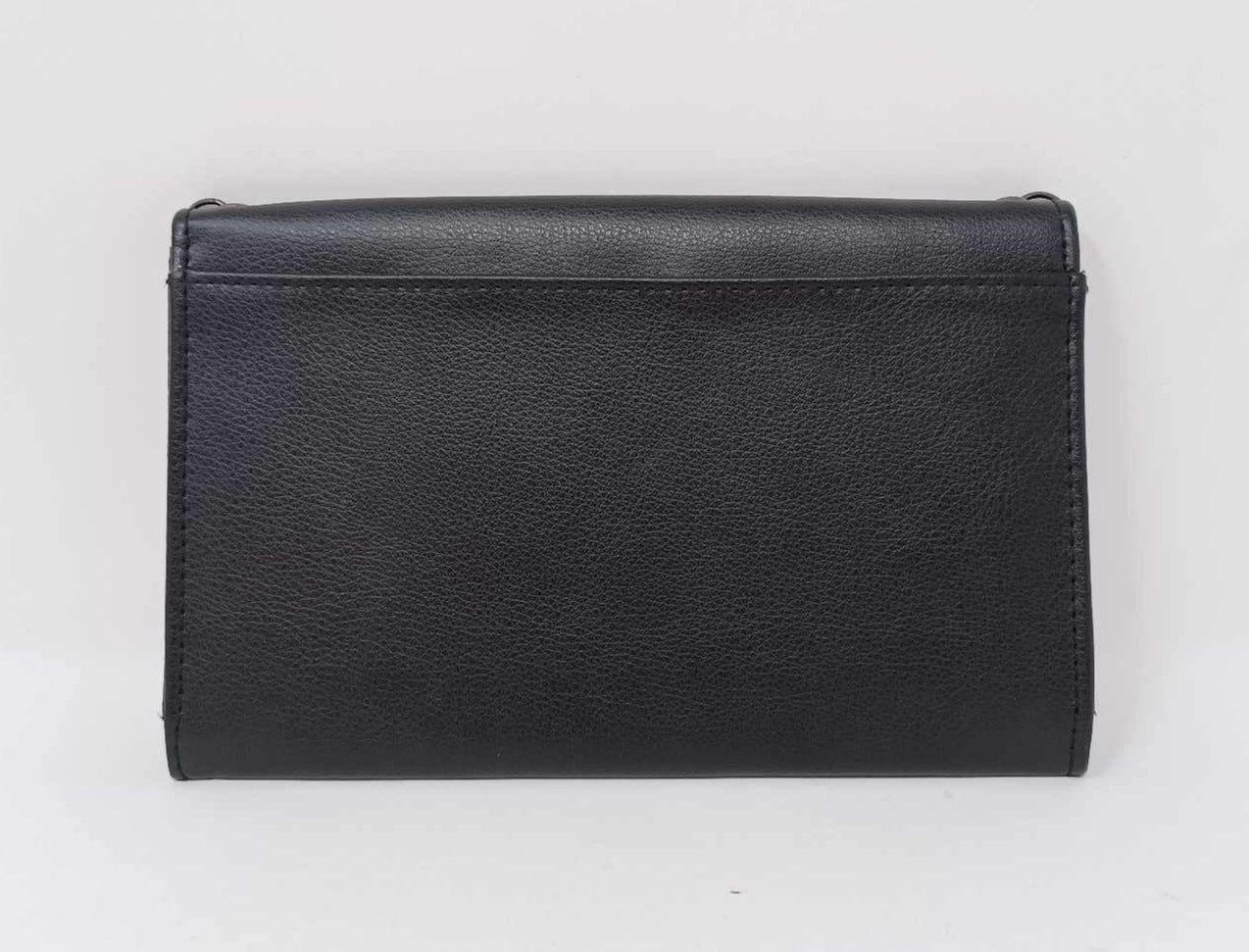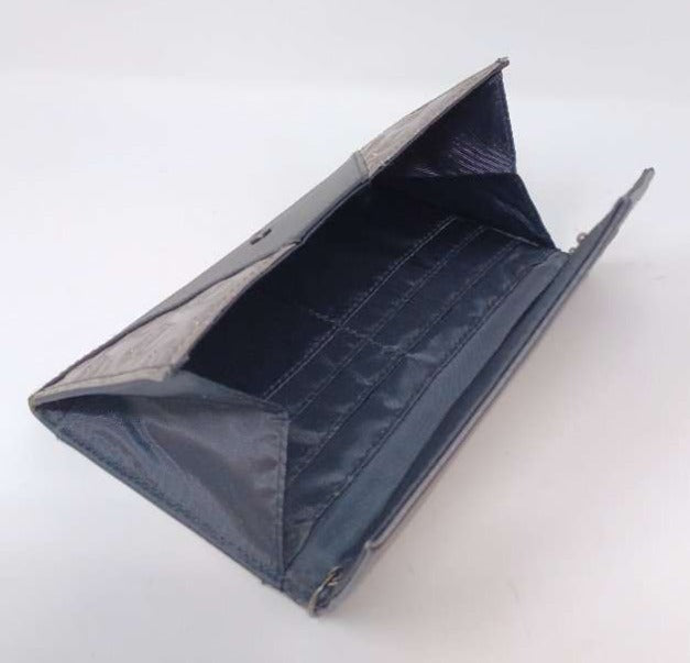 Faux leather, w/ two silver contrasting panels embossed w/ a repeating stormtrooper helmet design. The front flap features an embossed Imperial ‘cog’ symbol appliqué & closes w/ a standard button dome clasp. Lined inside w/ black fabric, w/ 6 card slots & one bill slot. The back has an open pocket, which is also lined in black fabric. When closed it measures approximately 6 x 4 x 1 inches