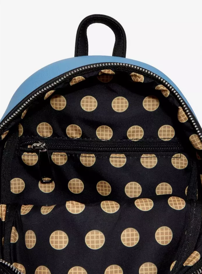 Stuff all the waffles in here! This mini backpack inspired by the first season of Stranger Things features a red & blue color-block design with embroidered silhouettes of Mike, Eleven, Lucas and Dustin on bicycles and a Demogorgon below in the Upside Down. There's even an interior lining of Eleven's favorite food: waffles! If you get thirsty while biking, there are water bottle pockets on both side. Interior zipper pocket, front zipper pocket, silver tone hardware and adjustable padded straps.