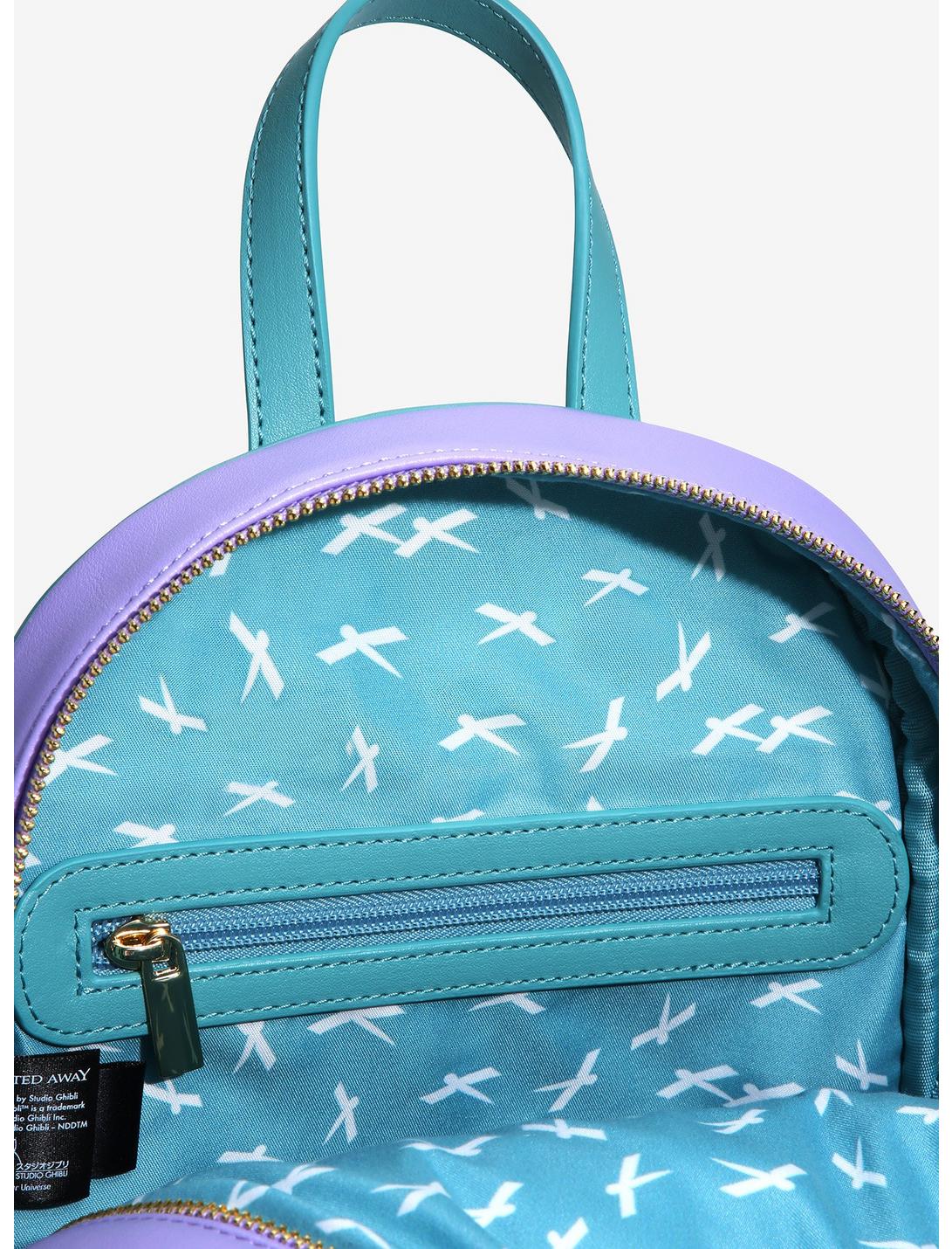 Whether it's to the Spirit Realm or to another fantastical place, you can carry all of your belongings in a Studio Ghibli style with this Spirited Away mini backpack from Our Universe! Inspired by the beloved animated movie, this two-tone bag features a colorful canvas that's made to match Haku's dragon form colors. With a front graphic of dragon Haku sharing a loving embrace with Chihiro, No-Face also appears on the included detachable coin purse, joining the duo to help accompany you on all of your travels. Also features gold-toned hardware, an enamel brand badge, two side pockets, adjustable shoulder straps, and a Shikigami interior lining pattern. Look closely and you'll spot Boh and Yubaba's Bird in their mouse and fly forms on the back!