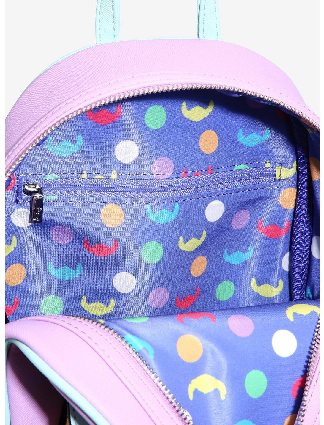 Everybody's favorite laundry-clad Disney "dog" is here, and he's here to save the day by carrying all of your daily essentials! Featuring a die-cut Stitch in his laundry "superhero" outfit with figural rainbow cape details on the front, this Loungefly mini backpack will make a colorful addition to your outfits. Also features adjustable shoulder straps, an enamel brand badge, an interior polkadot and Stitch silhouette pattern lining, and an enamel laundry basket zipper pull.