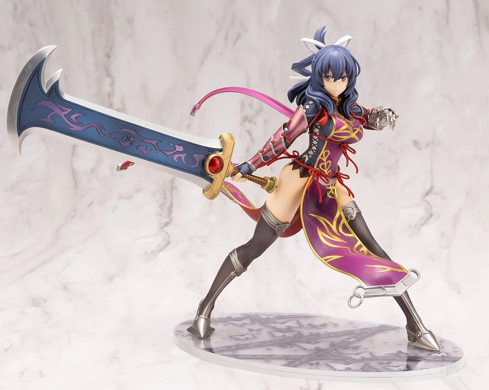 Remaining faithful to the game, she comes to life boldly wielding her giant sword effortlessly in one hand. Wearing a gorgeous Eastern-inspired outfit, her beauty and strength combine to make the perfect finish for this masterpiece. The base is painted with the chains and butterflies she uses in battle, which adorn the figure beautifully.