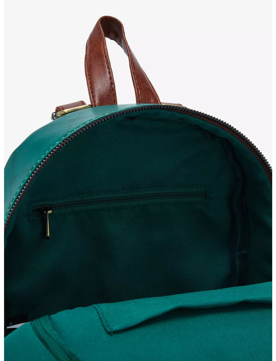Inspired by Link's outfit in The Legend of Zelda video game series, this mini backpack is dark green and brown with a front pocket with flap closure printed with gold foil. The front of the backpack has a Triforce symbol. Adjustable straps and interior pocket.