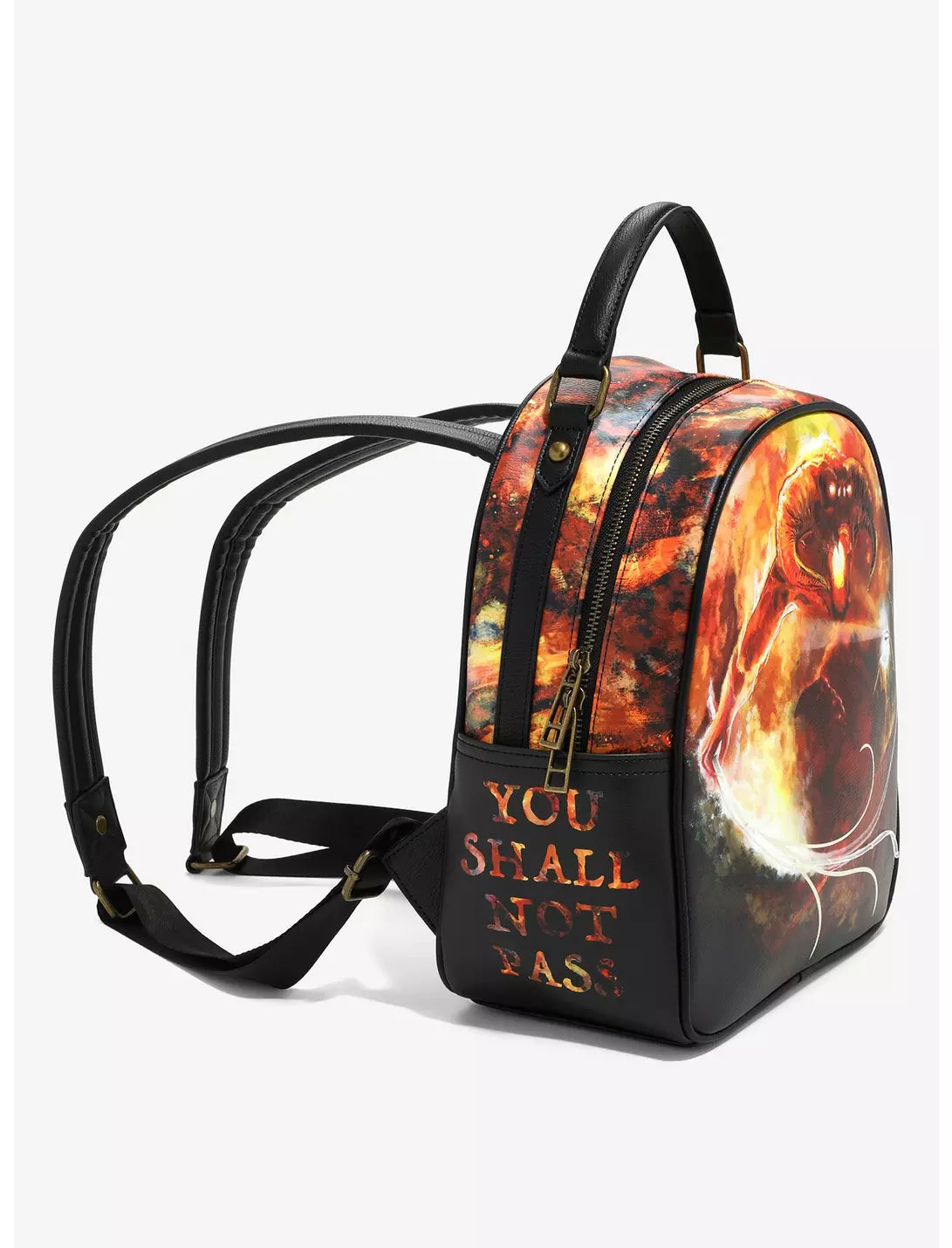 Carry your essentials in Middle-earth style with this Lord of the Rings-inspired mini backpack! Featuring Gandalf facing off against the Balrog, the front includes light up details along the staff and whip. With a glow-in-the-dark Door of Durin on the back, this bag is perfect for your next trip to Mordor and beyond.