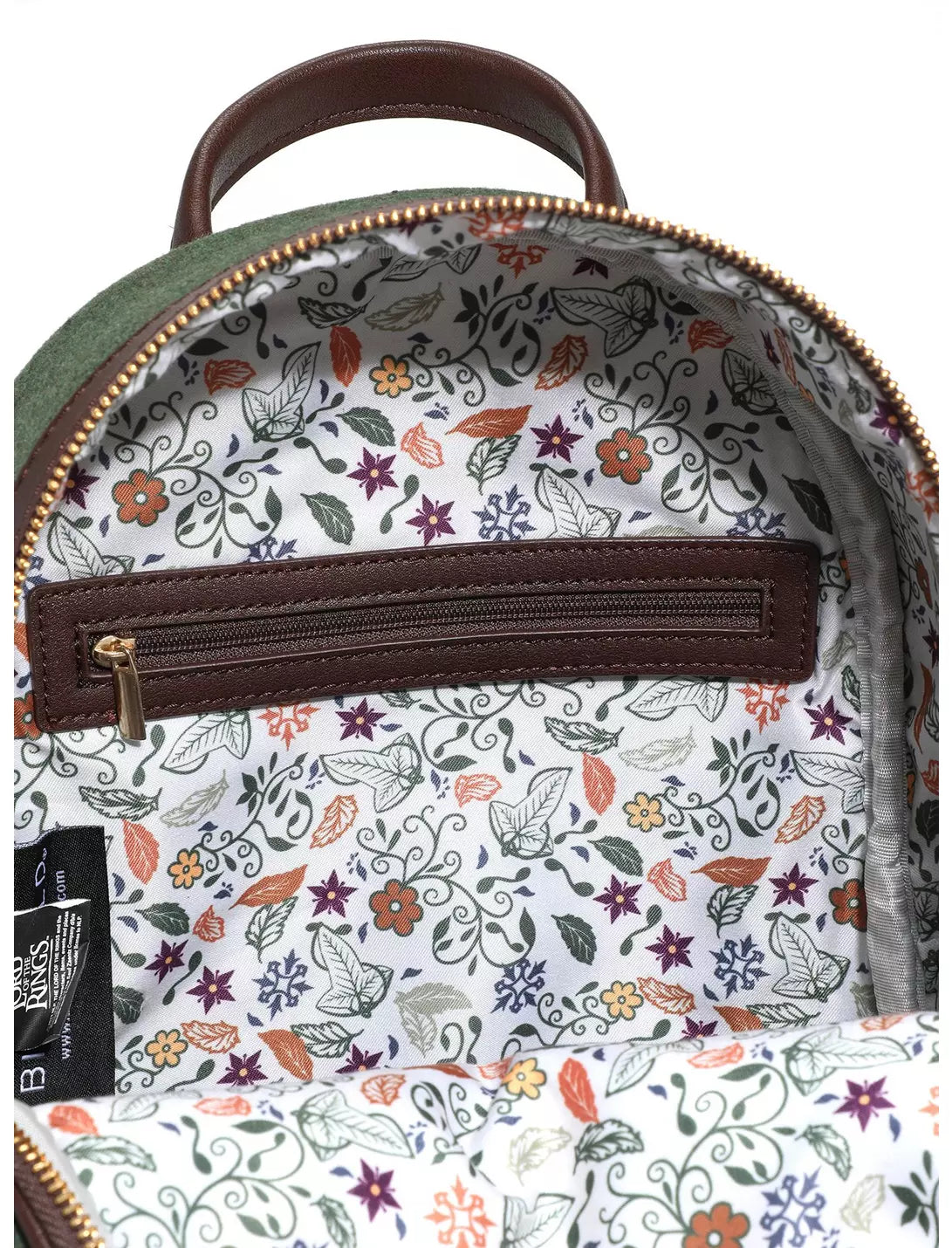 Embark as a member of the Fellowship with this Lord of the Rings backpack! As seen in the Peter Jackson's films, this bag's exterior shows off a metal-buttoned, suede hobbit vest and Frodo's felt cloak, a rich green fastened by a gorgeous three-leaf clasp. Inside are lush-leafed patterns reminiscent of Middle-Earth, and don't forget the One Ring on the zipper!
