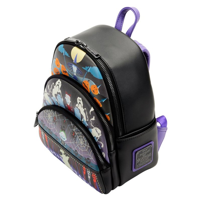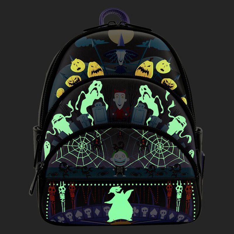 Oogie Boogie has sent his finest trick-or-treaters to carry out his dastardly plans. Stay on his good side, or he may send his mischievous henchmen after you! The Loungefly Nightmare Before Christmas Glow Triple Pocket Lock, Shock, and Barrel Oogie Boogie Mini Backpack features Oogie Boogie as he spins on a roulette wheel. Up above, Lock, Shock, and Barrel can be found lurking in some spooky hideaways of Halloween Town. Turn the bag around to find Oogie’s dice, waiting to decide your fate! This frightfully fun accessory glows in the dark and has plenty of room for storing your tricks and treats.