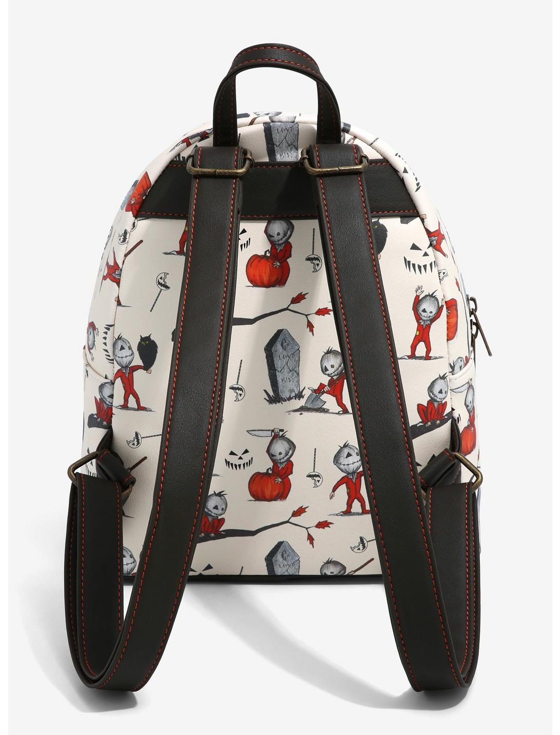 Head to Warran Valley, Ohio, for your Halloween style inspo! This allover print mini backpack inspired by horror comedy classic Trick 'R Treat features main character Sam in different scenarios, plus jack-o'-lantern faces. Front zipper pocket and adjustable straps. Wallet not included.