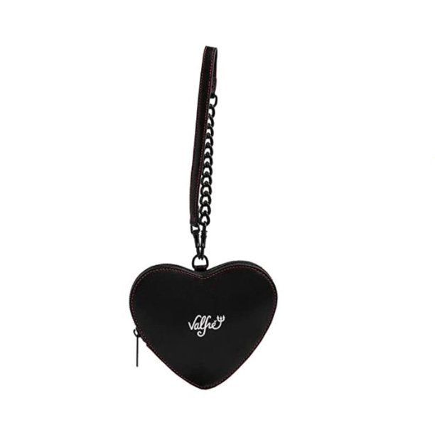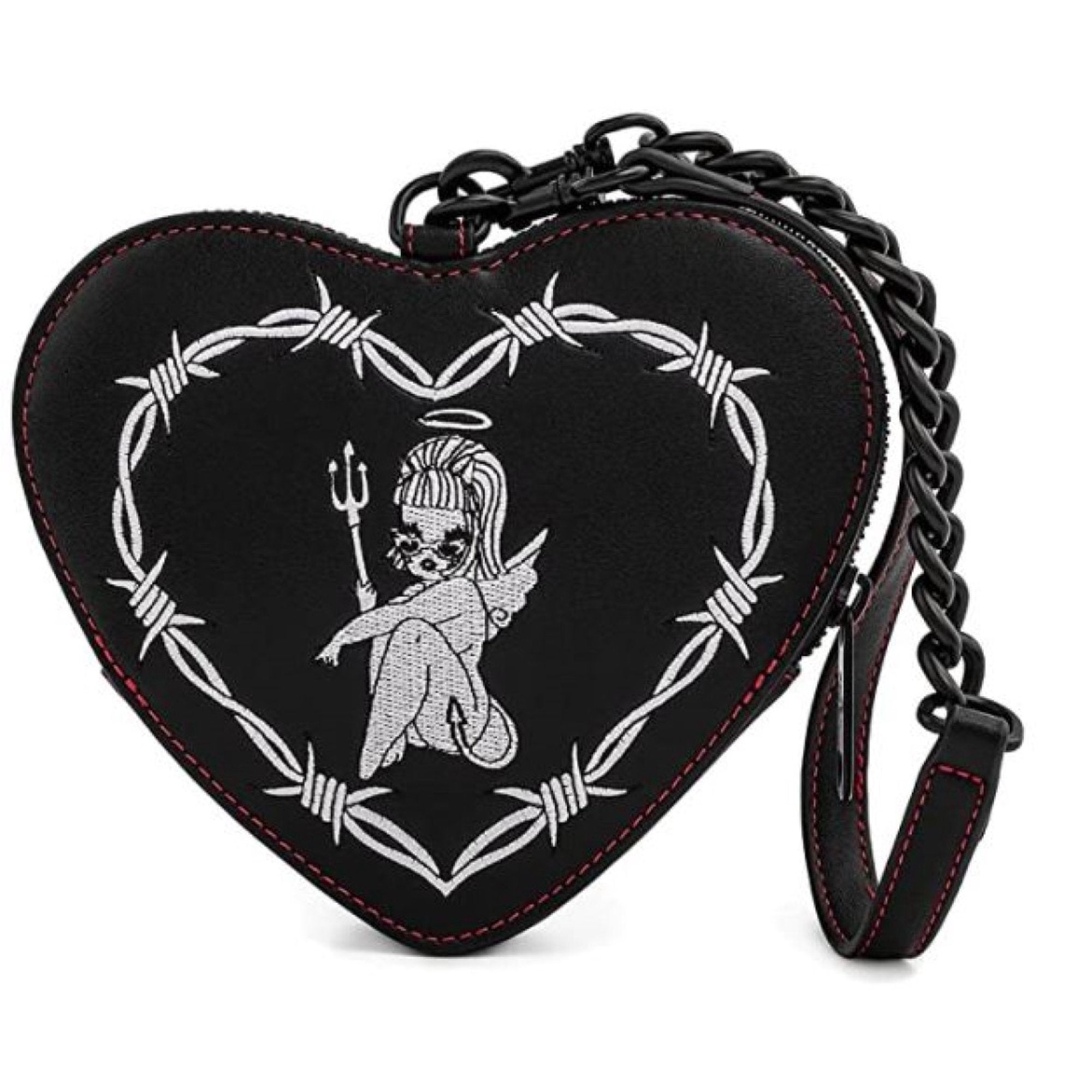 The Valfré Lucy Heart Wristlet Wallet is a sizzling addition to any outfit with its pattern of barbed wire surrounding a pitchfork holding angel. The chain detail on the wristband adds a punk flair too. Featuring: Detachable wristband strap, heart shape body, sturdy metal hardware, chain details wrisklet strap, features printed details, printed lining inside the bag Wallet measures approx 6.5” W x 3” H x .75” D